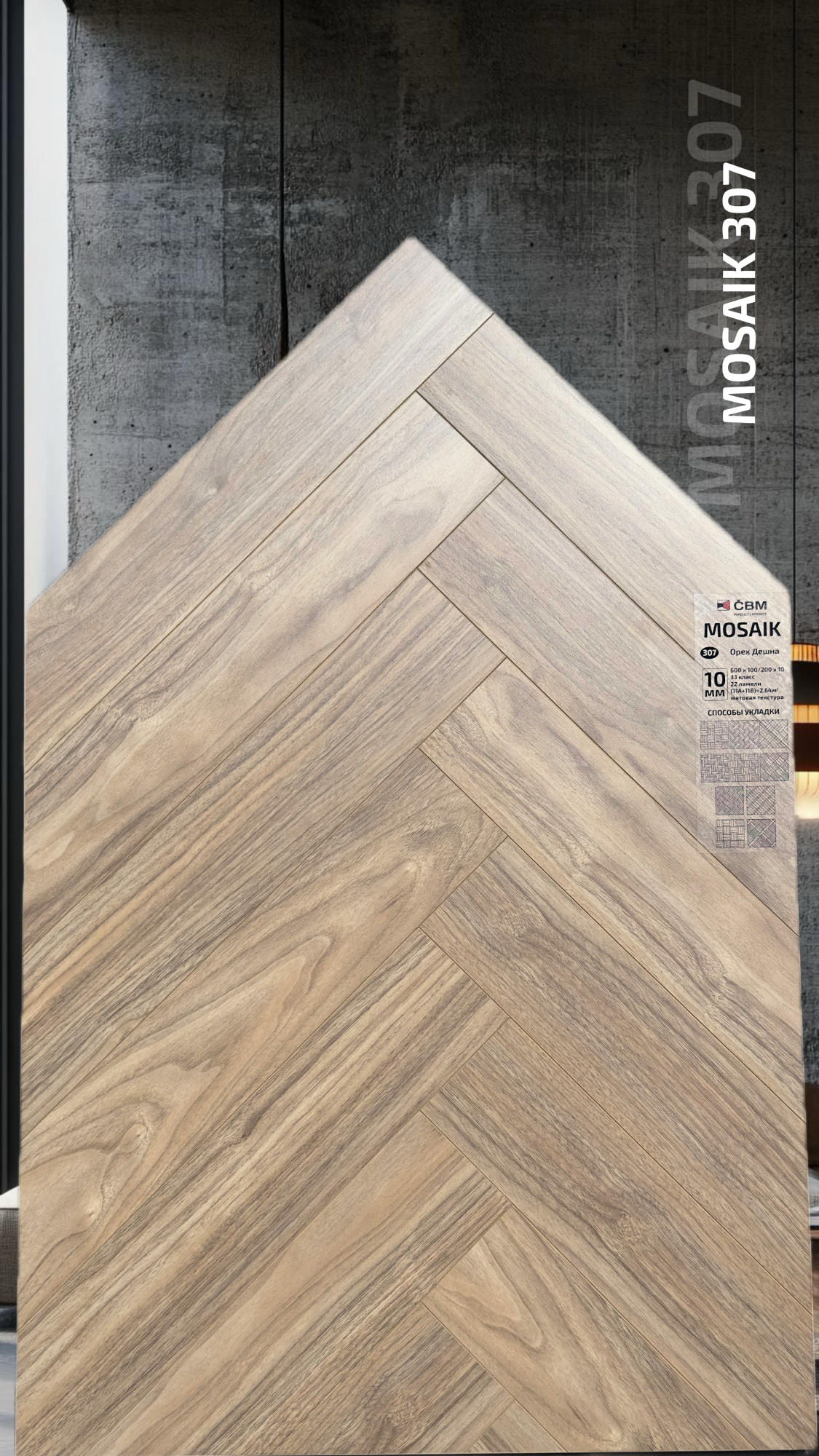 Страна производства Чехия Коллекция Mosaik Класс пожарной опасности КМ 3 Производители ламината Cbm Класс ламината 33 Толщина доски ламината 10 мм Размеры доски ламината 600х100 мм Вид\Имитация материала Ёлочка Упаковка ламината 2,64 м2, досок (22А+22В), 23,4 кг. Наличие фаски ламината 4х-сторонняя Влагостойкость ламината Повышенная Срок эксплуатации ламината (в домашних условиях) 25 лет -