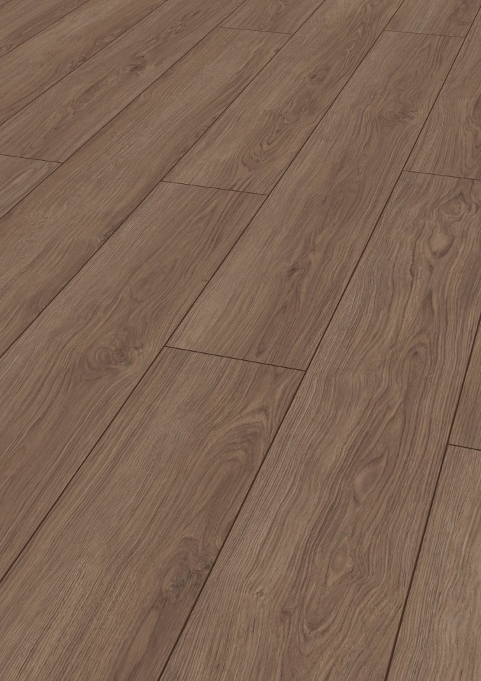 Ламинат Kronotex (Кронотекс) Дуб портовый — выбор для тех, кто ищет прочное напольное покрытие для квартиры или офиса. Класс износостойкости 33 и толщина 12 мм подходят для активной эксплуатации: в прихожей, гостиной или коммерческих помещениях. Темно-коричневый цвет и однополосный рисунок создают эффект массивной доски, а четырехсторонняя фаска формирует аккуратные стыки и придает полу рельеф.